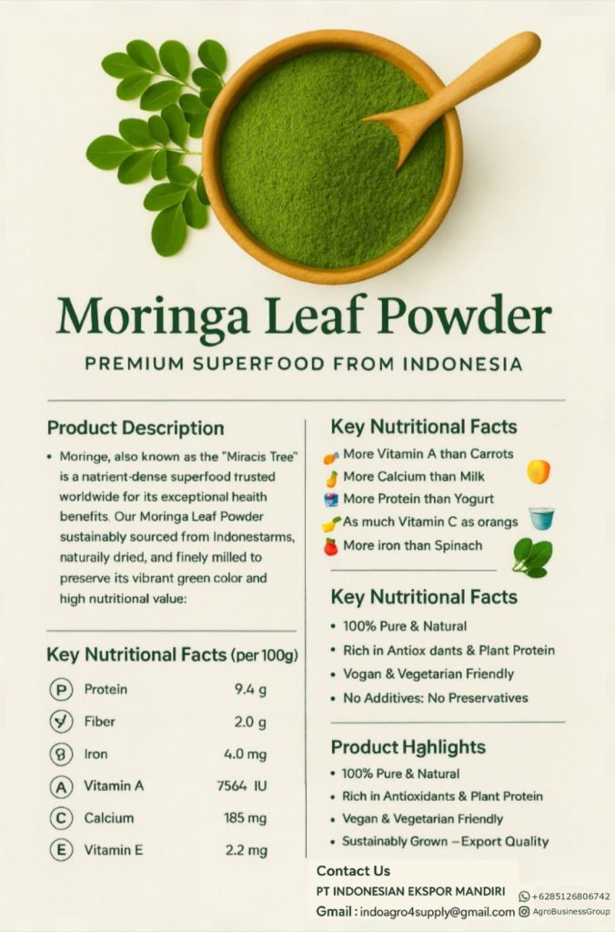 We operate from Lombok, West Nusa Tenggara—a region known for its fertile soil and tropical climate ideal for agriculture. From this location, we select the finest products, including Moringa Leaf Powder, Fresh Potatoes, Fresh Cabbage, Fresh Chinese Cabbage (Napa Cabbage), and Fresh Shallots (Red Onions) for export quality. All our products are processed under strict hygiene, quality, and freshness controls.